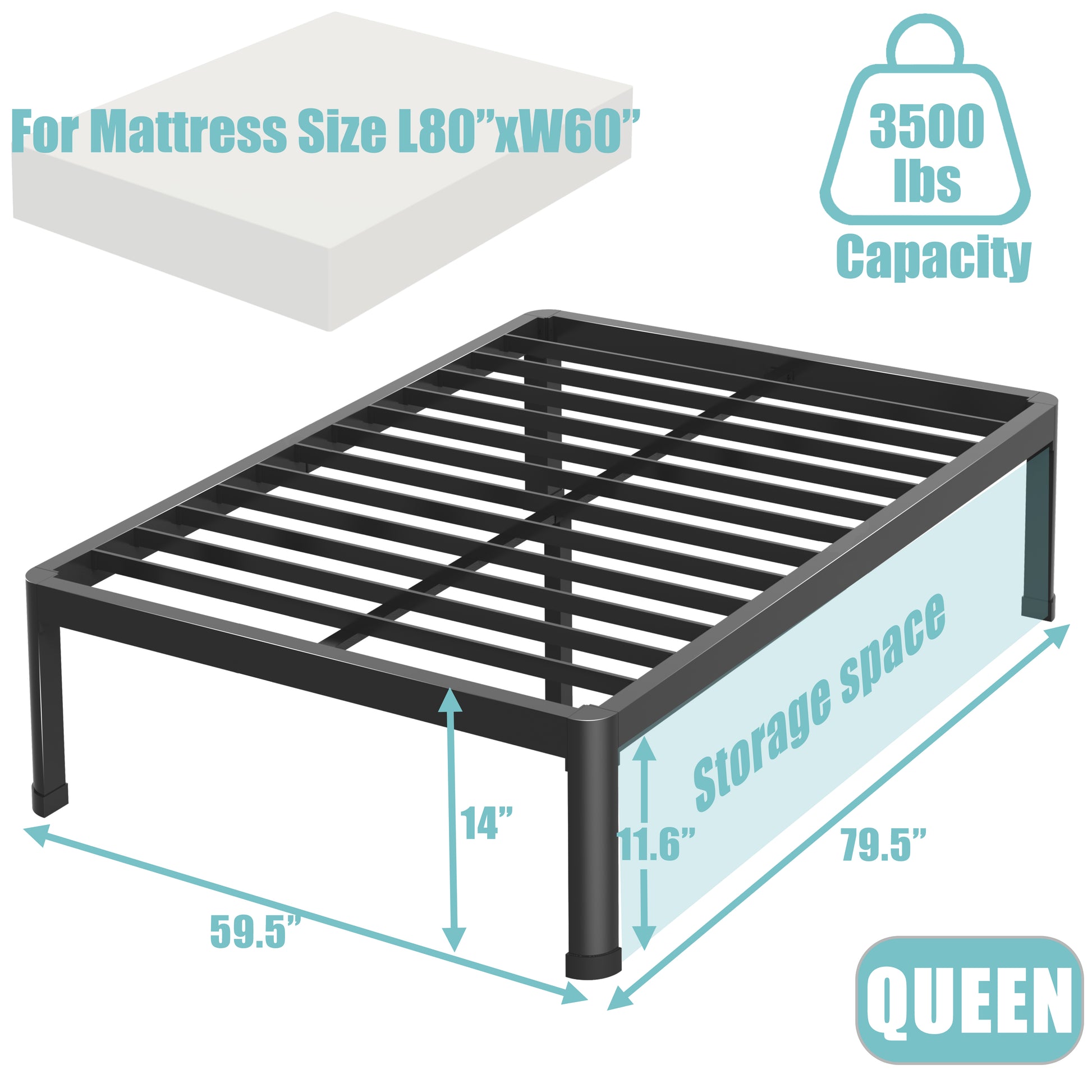 - 【Under-bed Storage】14/18-inch high black bed frame with 11.6-inch high storage space under the bed.