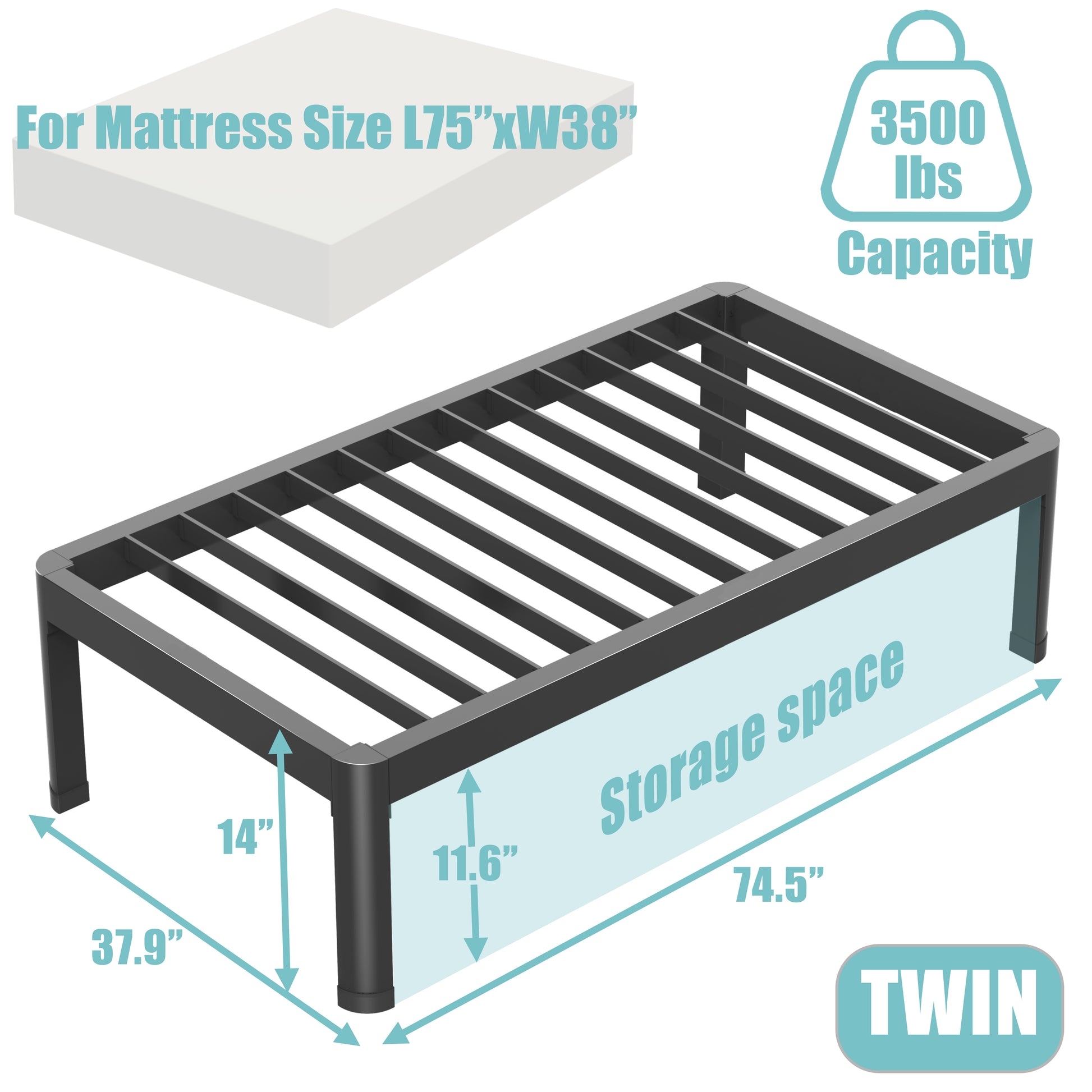 - 【Heavy Duty Bed Frame】The twin bed frame is made of alloy steel with reinforced structure. It won't shake or creak when you lie down to rest on it. The maximum weight-bearing capacity of the bed frame is up to 3500 lbs.