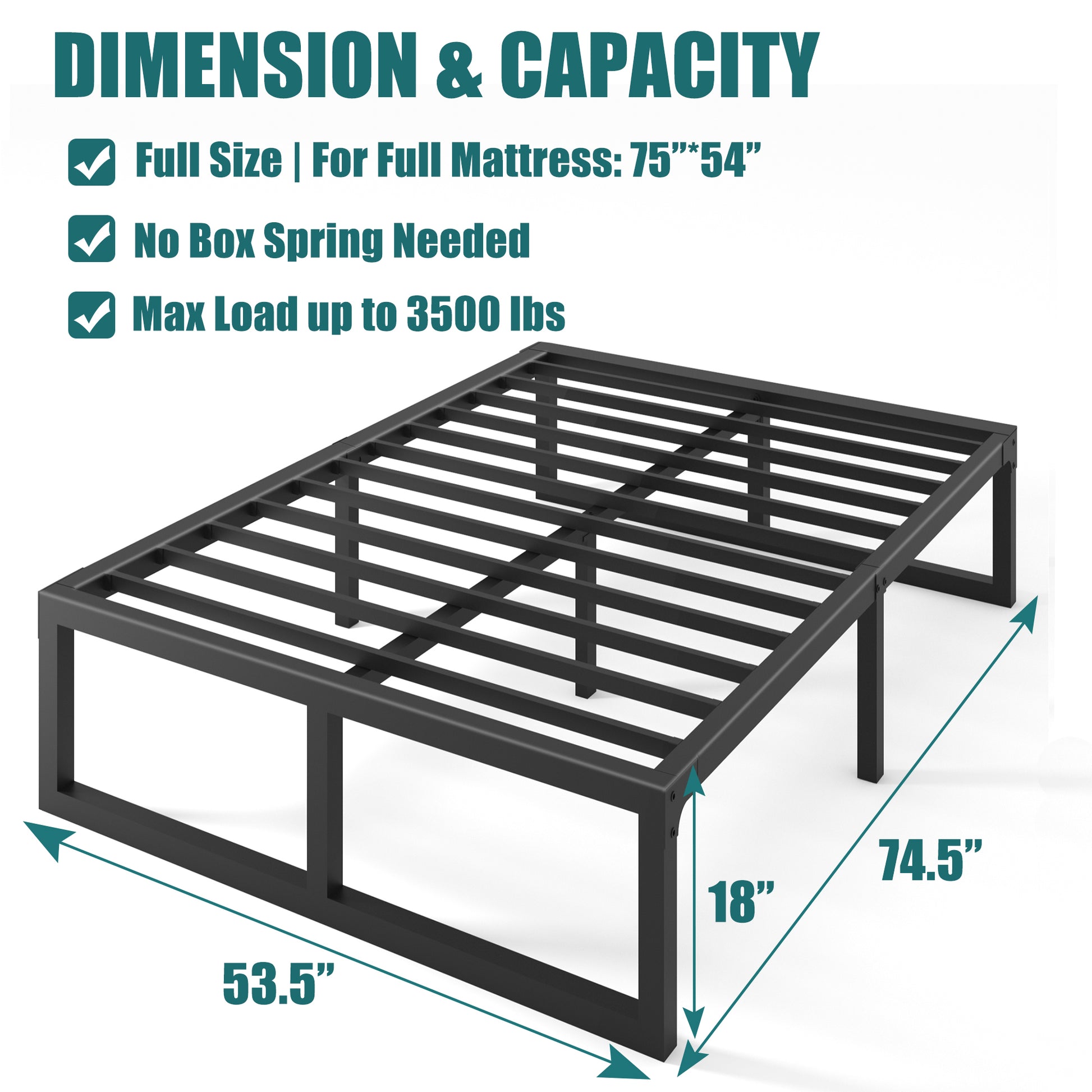 - 【Heavy Duty Bed Frame】The Full size bed frame is made of alloy steel with reinforced legs designed to prevent structural distortion and support up to 3500 lbs of weight.