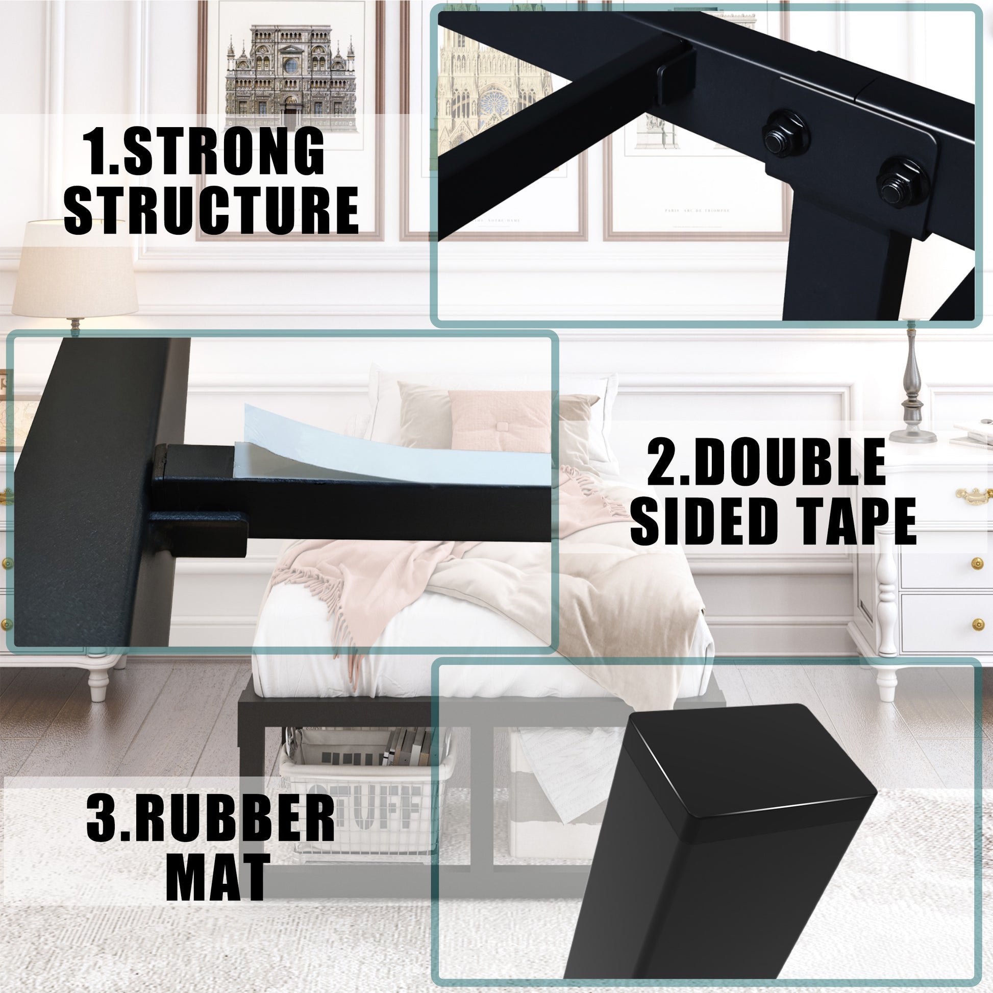 - 【Non-slip Design】The steel slats comes with four strips of tape to effectively reduce mattress slippage. The foot plug added to the bottom of the bed frame support foot prevents the bed frame from sliding and protects your floor from being scratched.